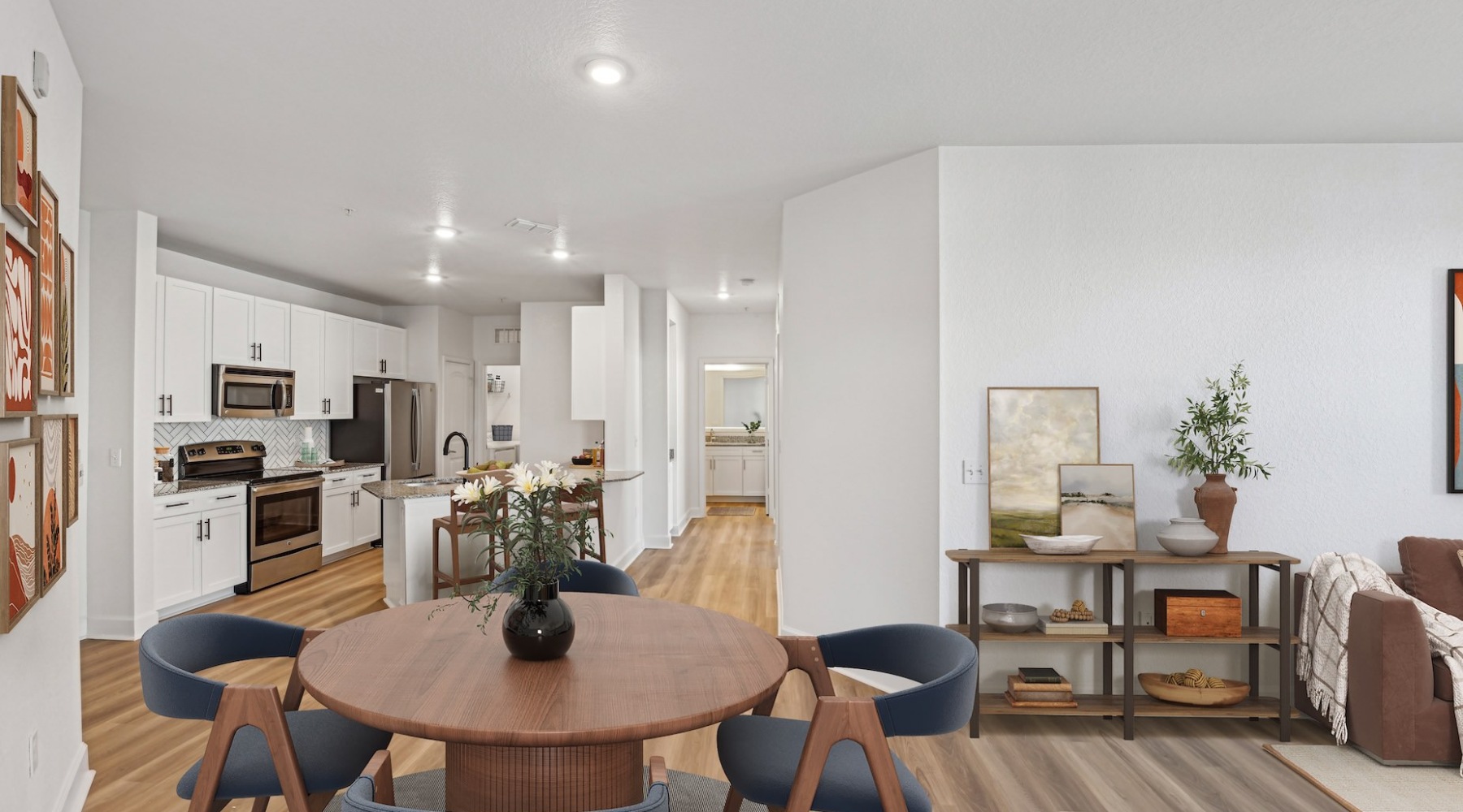 Inside your apartment, enjoy sleek finishes, generous layouts, and modern essentials like attached garages and in-unit laundry. Step outside to explore our resort-style pool and shaded outdoor lounges—perfect for relaxing after a day at work—or power up your car at our onsite electric vehicle (EV) charging stations. Whether you're working remotely in the business center, taking your dog for a stroll, or staying active in the fully equipped fitness center, you'll find that every feature here is designed to support your life.